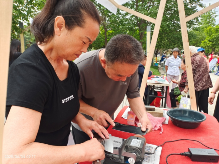 現(xiàn)場一角,經(jīng)驗(yàn)豐富的志愿者磨刀師傅剛支起攤位,就吸引了眾多居民前來。大家紛紛從家中拿出銹跡斑斑、刀刃鈍鈍的剪刀、菜刀,有序排隊(duì)等待。經(jīng)過志愿者的精心打磨,不一會兒,原本遲鈍的刀刃變得鋒利如新?!斑@菜刀都用了好多年,鈍得沒法用,正想著該怎么處理,社區(qū)就舉辦了這個活動,真是太及時、太貼心了!”居民李阿姨拿著磨好的剪刀,臉上洋溢著滿意的笑容。