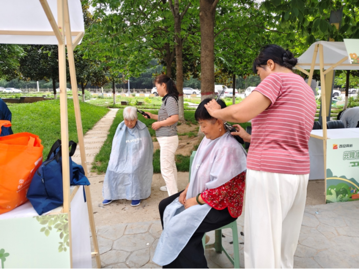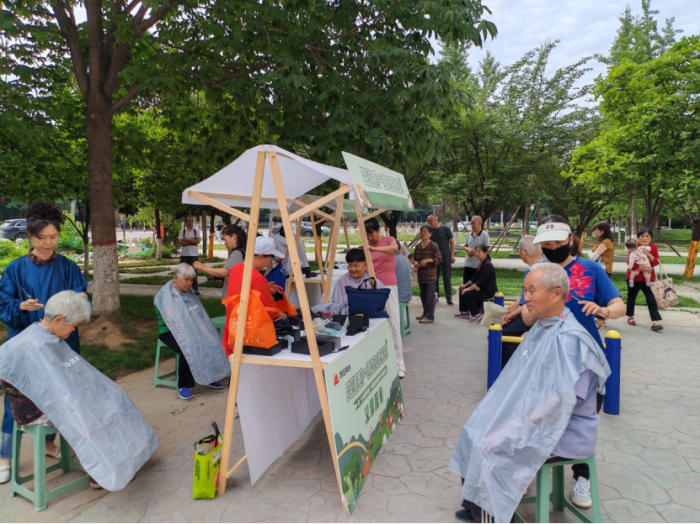 在廣場另一角,社區(qū)志愿者正在熱火朝天的開展義剪服務(wù),她們用嫻熟的技術(shù)為老人們修剪頭發(fā)之余,還與老人們閑話家常,傾聽并了解老人們的生活日常及身體狀況?!懊看慰吹嚼先藗儩M意的笑容和聽到肯定的話語,我們都覺得這樣做很有意義,我們會持續(xù)做下去的?!敝驹刚哒f道。