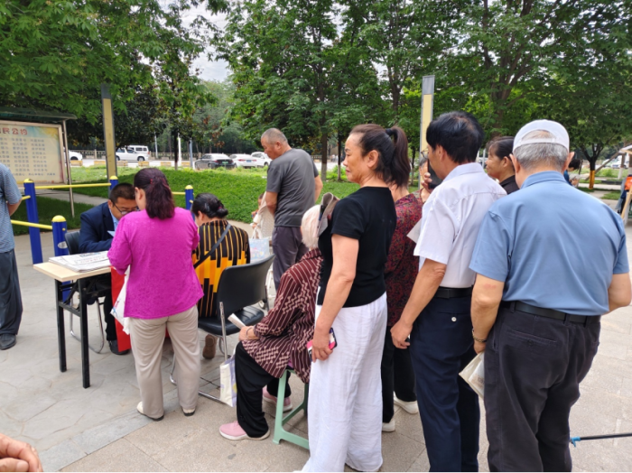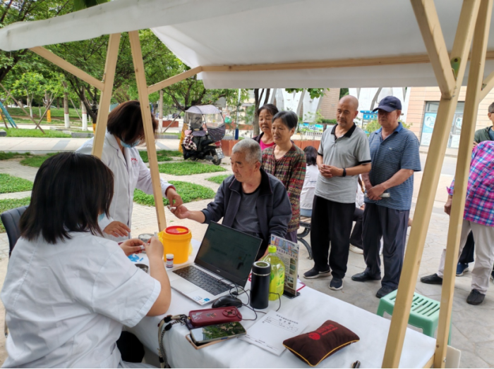 義診攤位,醫(yī)護(hù)人員為轄區(qū)居民開展血糖血壓測量、中醫(yī)問診等健康檢查,針對每位老人的情況提出相應(yīng)的治療建議,叮囑老人們在日常生活中要注意飲食,保持健康心態(tài)。