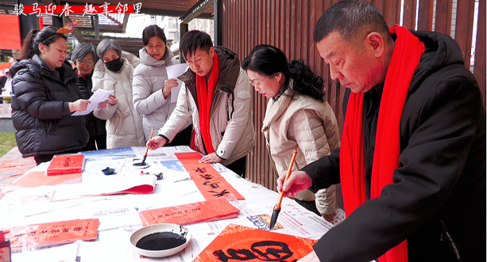 書法展臺墨香四溢,書法家和書法愛好者揮毫,將“馬躍新程”“駿馬奔騰”等新春祝?;鬈S然紙上的藝術(shù)。特別設(shè)置的“手寫唐詩”體驗(yàn)區(qū)大受歡迎,居民在紅箋上書寫經(jīng)典詩句,還用“唐詩之都”小程序生成專屬AI唐詩,感受西安"唐詩之都"文化底蘊(yùn)。投壺區(qū)居民專注投擲,歡聲笑語中盡顯文化自信。
