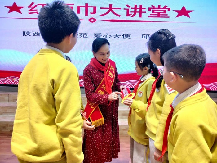 邱華老師從事慈善公益20多年,今天,她向隊(duì)員們分享了幾件志愿服務(wù)故事,讓隊(duì)員們切實(shí)感受到了她身上閃耀著新時(shí)代的雷鋒精神;張景衡老師做為志愿輔導(dǎo)員,一直致力于少年兒童政治啟蒙和價(jià)值觀塑造,活動(dòng)中,他與隊(duì)員們共讀《雷鋒日記》,讓隊(duì)員在雷鋒同志的話語中感知其為人民服務(wù)的精神,無私奉獻(xiàn)的胸懷,進(jìn)而汲取榜樣身上無窮的力量;秦腔表演藝術(shù)家陳金鋒老師連夜將雷鋒精神的內(nèi)容改編成秦腔,時(shí)代精神與國(guó)粹藝術(shù)相結(jié)合,帶給師生別樣感受。