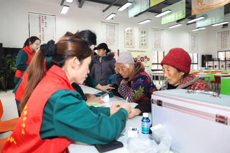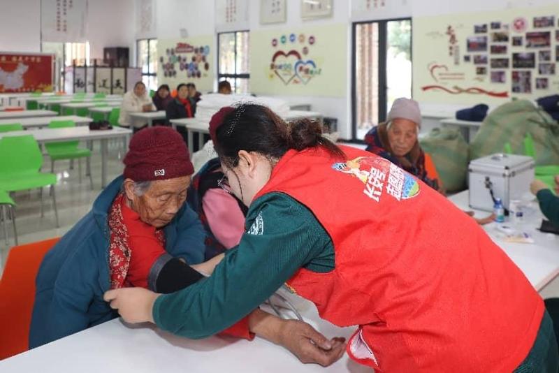 服務(wù)隊(duì)成員走訪了楊賀村幾戶村民家庭后,又趕往新筑街道于新村。在該村新時(shí)代文明實(shí)踐站內(nèi),志愿者們搭建起臨時(shí)服務(wù)點(diǎn),為20余名老人開展量血壓、測(cè)血糖服務(wù),并且逐一發(fā)放被子、枕頭等御寒物資。