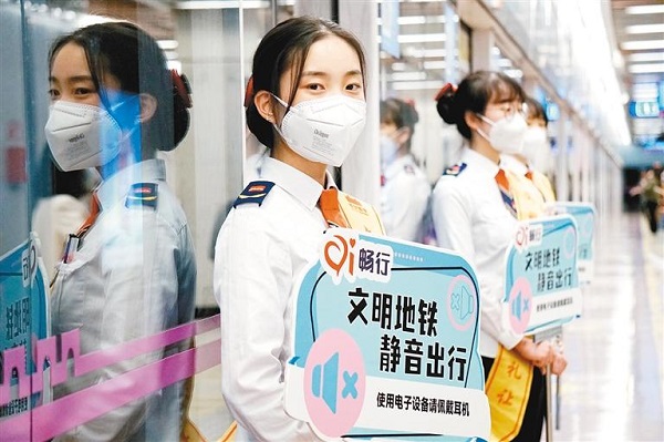 圖為地鐵工作人員手持“靜音出行”提示牌引導(dǎo)乘客共同營造安靜的乘車環(huán)境。 (首席記者 李明 攝)