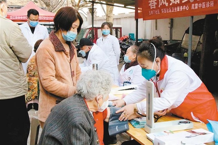 環(huán)西社區(qū)衛(wèi)生服務(wù)中心和芪蒙中醫(yī)診所的大夫現(xiàn)場為居民義診。量血壓或是診脈后,醫(yī)生結(jié)合檢查結(jié)果詳細(xì)詢問居民日常作息習(xí)慣、細(xì)致叮囑生活飲食注意事項、耐心解答健康方面各種疑問,并給出指導(dǎo)建議。