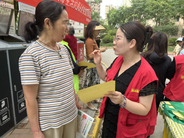 上林街道三里橋社區(qū)文明實(shí)踐站在灃河河堤路設(shè)置移動(dòng)宣傳站,結(jié)合水體保護(hù)講解垃圾混放危害;底張街道文明實(shí)踐所工作人員則將垃圾分類知識直接送到了商業(yè)街區(qū)的門店商鋪。