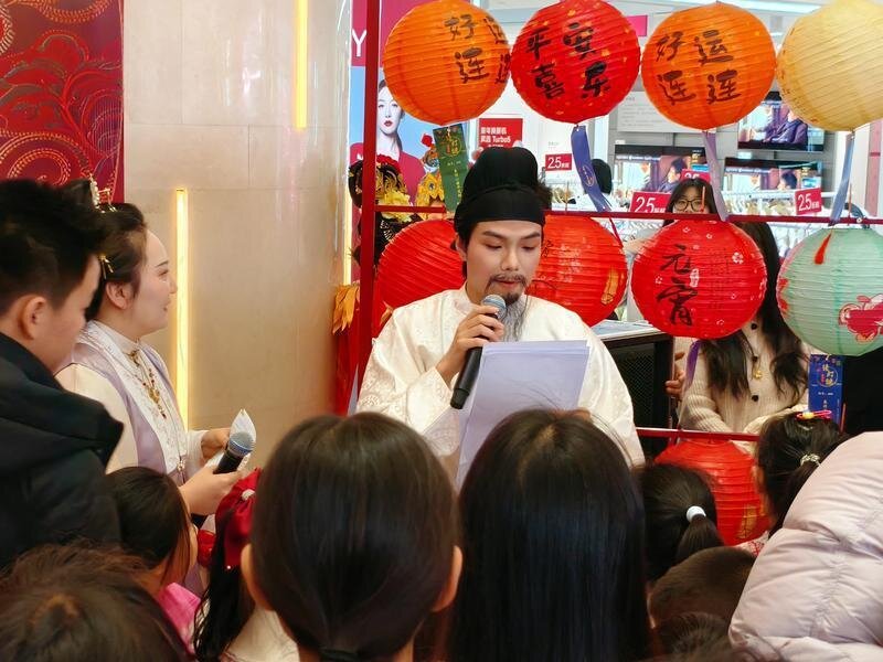 身著古裝的“詩(shī)仙李白”一亮相,便成為全場(chǎng)最關(guān)注的焦點(diǎn)。他漫步人群之中,隨機(jī)拋出燈謎與唐詩(shī)上句,邀請(qǐng)市民游客現(xiàn)場(chǎng)對(duì)答互動(dòng)。“床前明月光——”話音未落,前排的小朋友們脫口而出:“疑是地上霜!”“春風(fēng)得意馬蹄疾”,6歲的小朋友洋洋聲音清脆響亮,自信地接道:“一日看盡長(zhǎng)安花!”流利的回答引來(lái)周?chē)黄Q(chēng)贊。