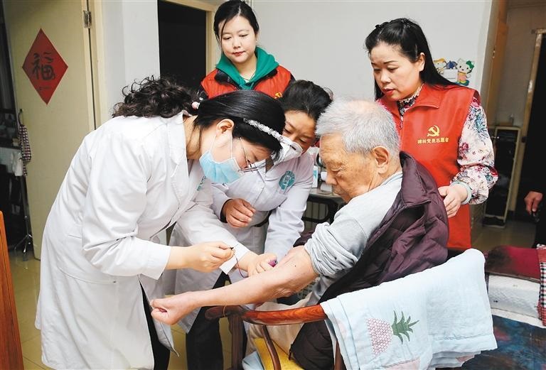 3月30日,醫(yī)生和社區(qū)志愿者為楊振中老人抽血化驗(yàn)血常規(guī)。當(dāng)日,為進(jìn)一步關(guān)心關(guān)愛(ài)轄區(qū)老人,提升轄區(qū)居民群眾健康水平,碑林區(qū)柏樹(shù)林街道三學(xué)街社區(qū)“向往三學(xué)”志愿者服務(wù)隊(duì)邀請(qǐng)柏樹(shù)林社區(qū)衛(wèi)生服務(wù)中心醫(yī)生,對(duì)轄區(qū)7位獨(dú)居、空巢和行動(dòng)不便的老人開(kāi)展送醫(yī)上門(mén)志愿服務(wù)活動(dòng),為老人測(cè)量血壓、抽血化驗(yàn)血常規(guī),受到老人們的歡迎和稱贊。 (西安報(bào)業(yè)全媒體首席記者 李明 攝)