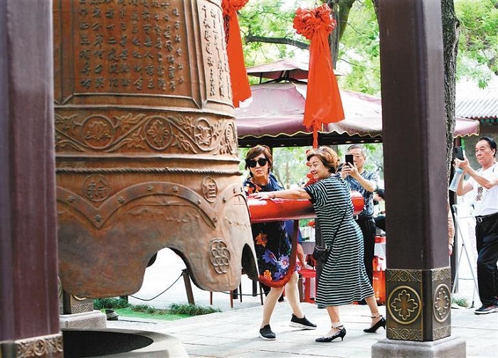 5月3日,游客在西安小雁塔下敲鐘祈福。 記者 尚洪濤 攝