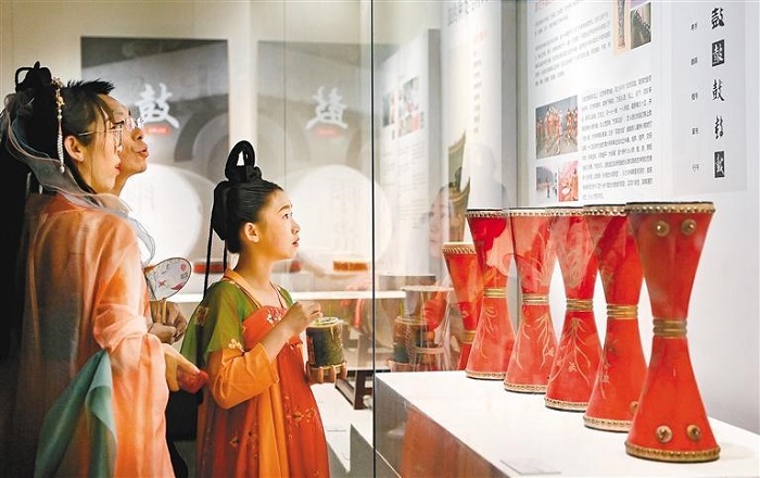 5月1日,游客在西安市鐘鼓樓博物館參觀鼓文化展。 新華社發(fā)