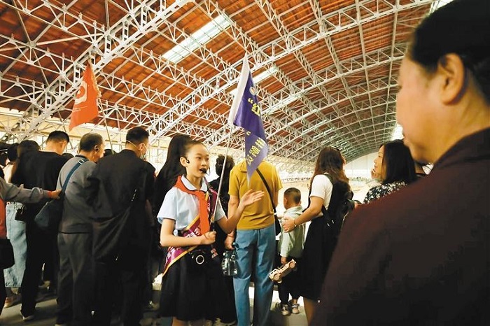 收官儀式上,秦始皇帝陵博物院工作人員為學(xué)生代表佩戴“家鄉(xiāng)文物我來(lái)講”小志愿者綬帶。孩子們帶領(lǐng)現(xiàn)場(chǎng)游客來(lái)到景區(qū)一號(hào)坑展廳,講解兵馬俑的“前世今生”。秦始皇帝陵博物院院長(zhǎng)李崗現(xiàn)場(chǎng)為孩子們?cè)凇凹t田”打卡通關(guān)文牒上,蓋下最后一枚打卡印章。50余名來(lái)自臨潼區(qū)華清小學(xué)的學(xué)生,興奮地展示著他們14站“紅田”愛(ài)國(guó)主義教育基地打卡足跡。