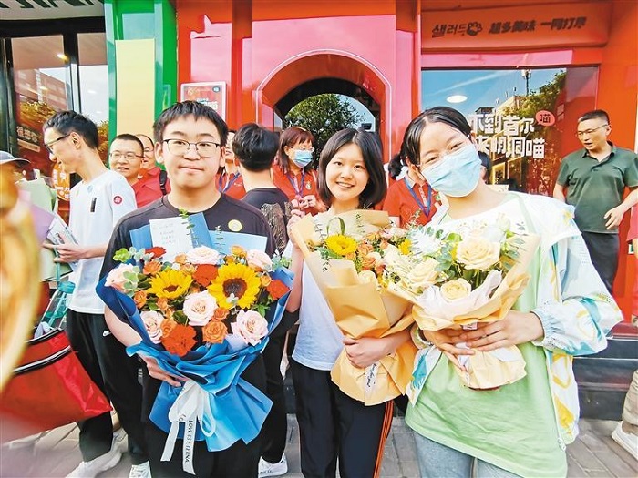 “你是最棒的,孩子!”考場外,有的家長為孩子送上了漂亮的鮮花,有的舉著醒目的向日葵,有的家長舉起手機與孩子合影?;仡檭商斓目荚囘^程,一位家長感慨地說,家長、送考老師們的紅色T恤為孩子們帶來“開門紅”、公安、交警、城管、疾控、志愿者……大家齊心協(xié)力,紛紛行動組成“護考天團”為考生安心應考保駕護航,安全感滿滿。尤其是今天考完最后一門,家長們更是合影、送花、送禮物“花式”迎接下考的孩子們,考場外一片溫馨的場景,令人感動。