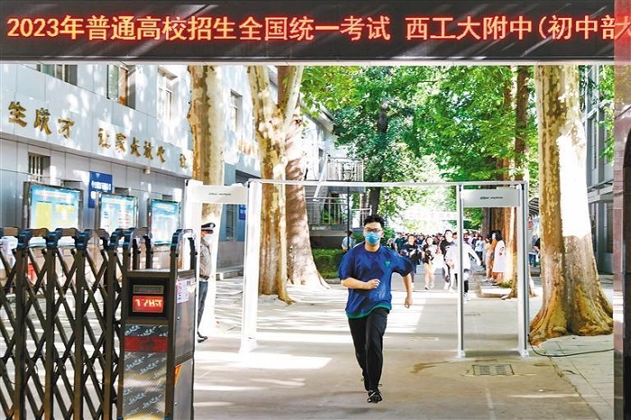 6月8日,一名考生考試結束后跑出西工大附中(初中部)考點。(記者 郝鐘毓 攝)