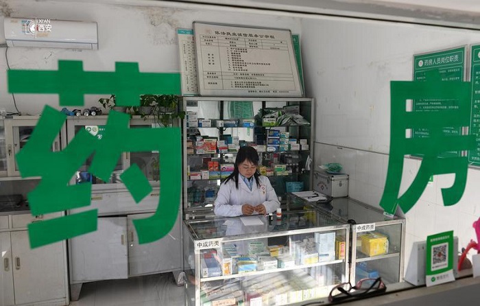 李艷梅在藥房?jī)?nèi)為村民配藥