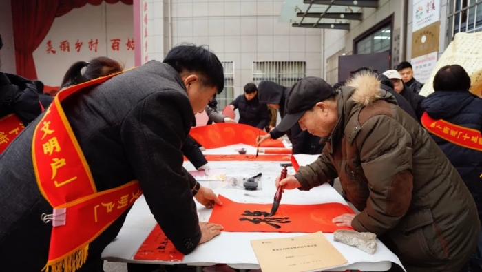 “陳規(guī)陋習(xí)隨風(fēng)去,文明新風(fēng)撲面來……”來自區(qū)文聯(lián)的書法志愿者揮毫潑墨,把一個個美好的祝福融入筆墨,把一句句對時代新風(fēng)的祈盼寫在紙上,引得群眾紛紛駐足觀賞,爭相領(lǐng)取。