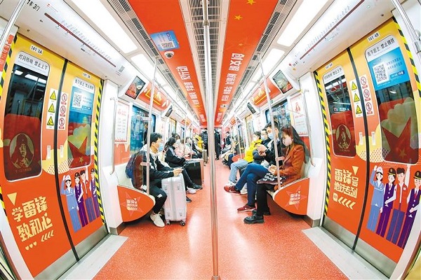 市民乘坐西安地鐵“雷鋒號(hào)”主題專(zhuān)列。(首席記者 李明 攝)