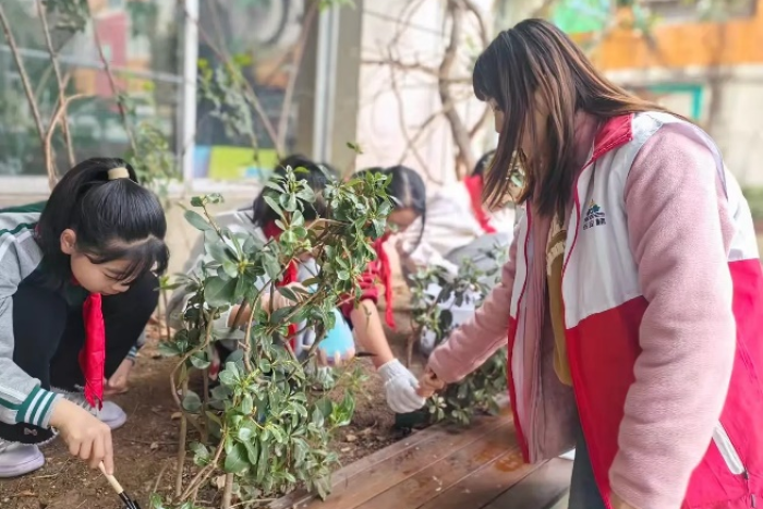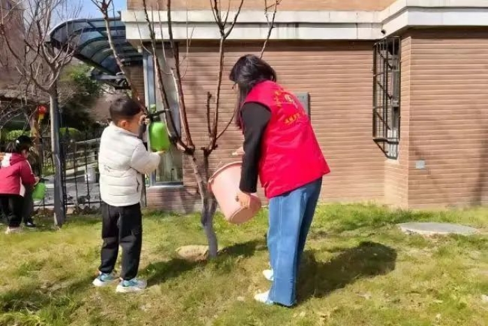 活動(dòng)當(dāng)天,社區(qū)網(wǎng)格員和學(xué)校老師帶領(lǐng)著小學(xué)生們組成“護(hù)綠小分隊(duì)”。孩子們分工協(xié)作,有的手持工具清理枯枝落葉,為綠植“梳妝”;有的在老師的指導(dǎo)下,為銀杏、桂花等樹木澆水灌溉;有的揮動(dòng)小鏟松土施肥,助力植物根系“呼吸”;還有的為綠植掛上親手制作的“護(hù)綠標(biāo)語牌”,呼吁居民共同愛護(hù)花草。