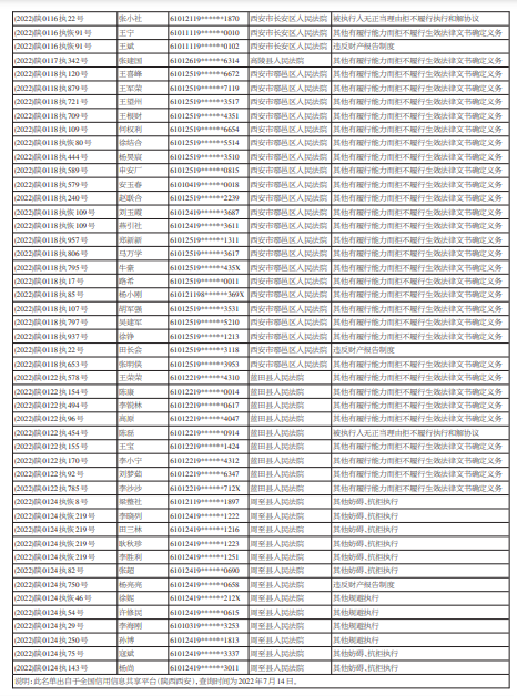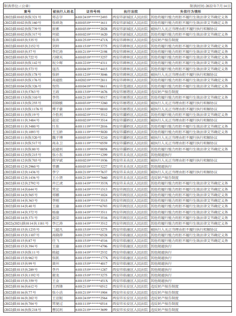 西安市失信被執(zhí)行人(自然人)名單(2022年1-6月)