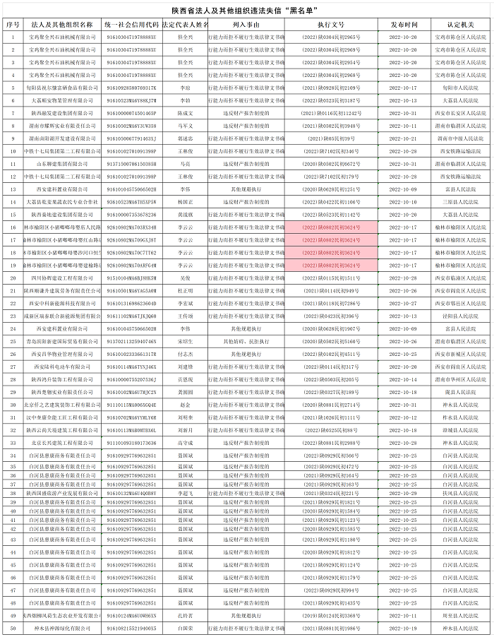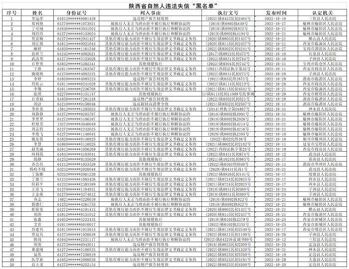 為深化“誠信陜西”建設,進一步推進誠信缺失突出問題專項治理常態(tài)化長效化,形成誠實守信、重信守諾的良好風尚,打造不敢失信、不能失信、不愿失信的社會環(huán)境。根據(jù)省委文明辦、省信用辦工作部署,現(xiàn)將2022年10月失信“黑名單”公布如下。