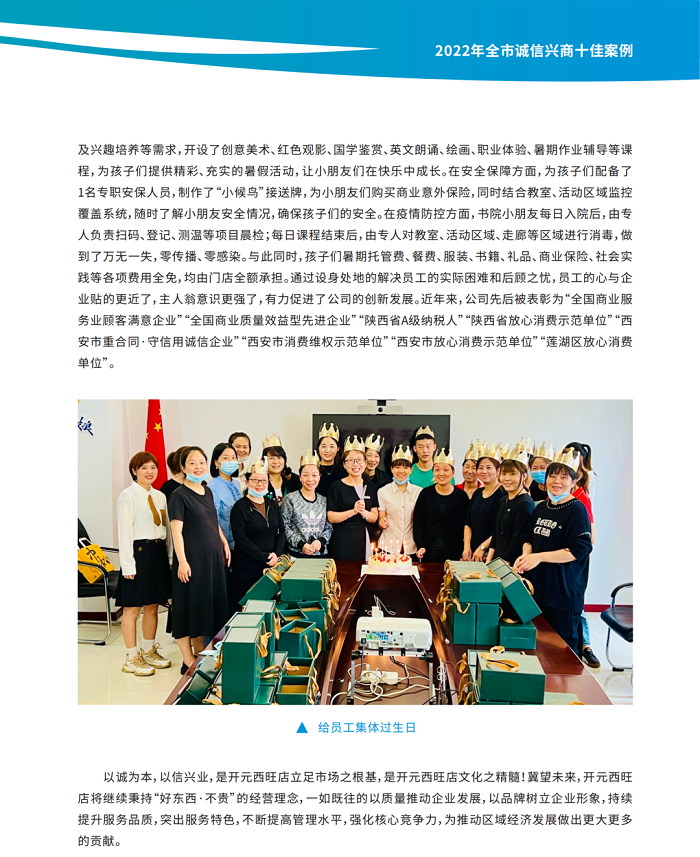為落實商務(wù)部及省市關(guān)于開展“誠信興商”宣傳活動有關(guān)要求,充分發(fā)掘我市商務(wù)領(lǐng)域誠信文化資源,持續(xù)打造誠信經(jīng)營和放心消費的良好環(huán)境,市商務(wù)局于5月17日印發(fā)《西安市商務(wù)局關(guān)于在全市商貿(mào)行業(yè)開展“誠信興商優(yōu)秀案例”征集和遴選工作的通知》(市商發(fā)〔2022〕64號),按照企業(yè)自愿申報、區(qū)縣行業(yè)主管部門初審?fù)扑]、市商務(wù)局組織專家評審并公示的方式,從全市上報案例中遴選出2022年全市“誠信興商十佳案例”和9個優(yōu)秀案例。