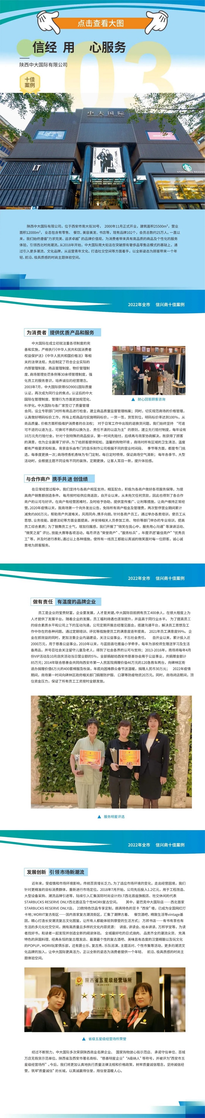 為落實商務(wù)部及省市關(guān)于開展“誠信興商”宣傳活動有關(guān)要求,充分發(fā)掘我市商務(wù)領(lǐng)域誠信文化資源,持續(xù)打造誠信經(jīng)營和放心消費的良好環(huán)境,市商務(wù)局于5月17日印發(fā)《西安市商務(wù)局關(guān)于在全市商貿(mào)行業(yè)開展“誠信興商優(yōu)秀案例”征集和遴選工作的通知》(市商發(fā)〔2022〕64號),按照企業(yè)自愿申報、區(qū)縣行業(yè)主管部門初審?fù)扑]、市商務(wù)局組織專家評審并公示的方式,從全市上報案例中遴選出2022年全市“誠信興商十佳案例”和9個優(yōu)秀案例。