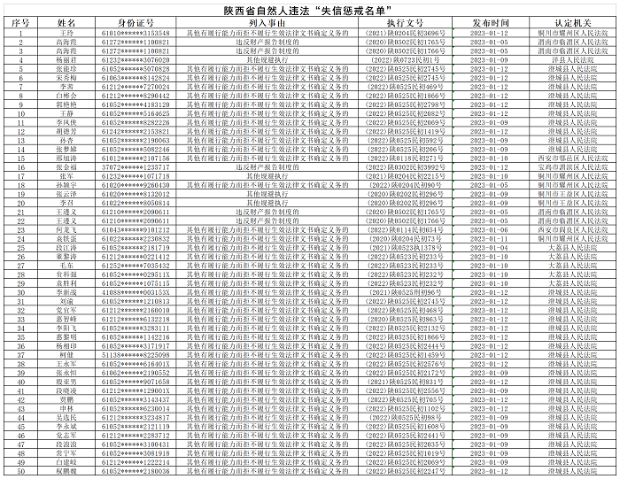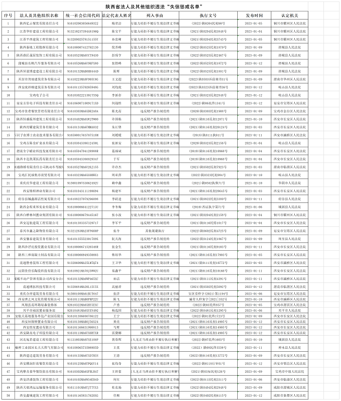 陜西省發(fā)布2023年1月守信激勵典型案例和失信懲戒對象名單