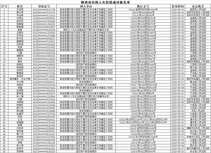陜西省自然人失信懲戒對(duì)象名單