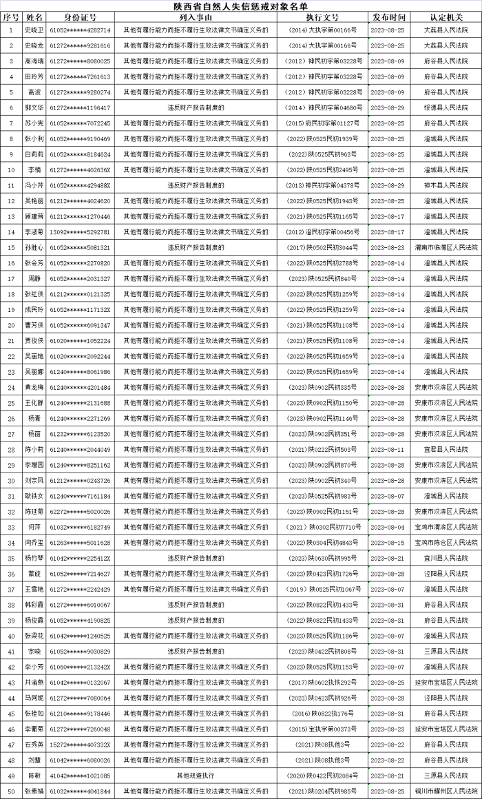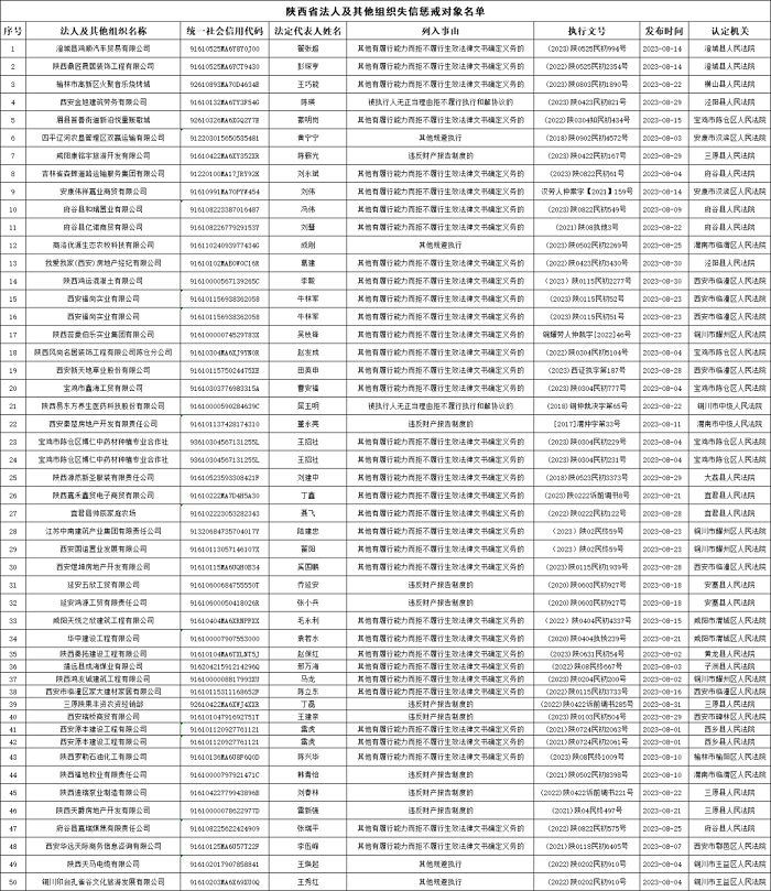 陜西省發(fā)布2023年9月守信激勵(lì)典型案例和失信懲戒對象名單