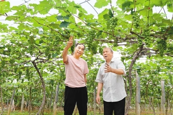科技特派員謝福鑫(右)在福建省南平市建陽(yáng)區(qū)考亭村一處葡萄園里指導(dǎo)果農(nóng)(5月27日攝)?! 。ㄐ氯A社記者 林善傳 攝)