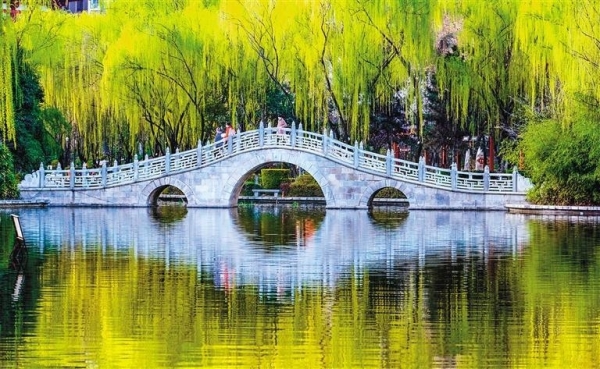 楊柳、拱橋倒映水中,行人穿行于橋上,美哉。(首席記者 王健 攝 資料圖片)
