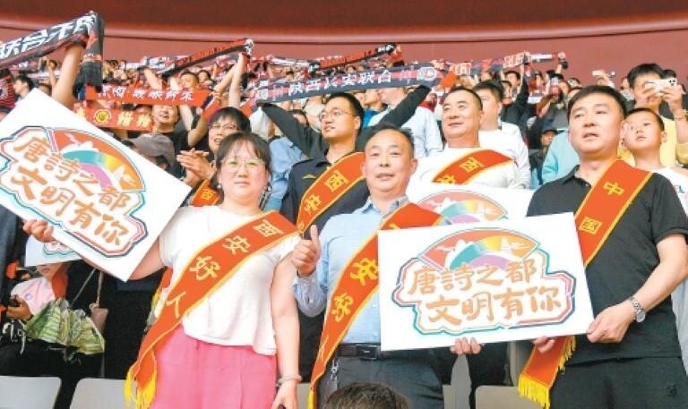 體育賽事是城市文明的窗口,文明觀賽是體育精神的延伸,這些道德模范當(dāng)中不僅有長(zhǎng)期投身于公益事業(yè)的“中國(guó)好人”,也有孝老愛(ài)親的“陜西好人”,還有敬業(yè)奉獻(xiàn)、助人為樂(lè)、誠(chéng)實(shí)守信的“西安好人”,更有見(jiàn)義勇為的“平民英雄”……他們手舉“唐詩(shī)之都文明有你”的牌子,用實(shí)際行動(dòng)引領(lǐng)文明觀賽;當(dāng)現(xiàn)場(chǎng)進(jìn)入高潮,看臺(tái)掀起人浪之時(shí),他們也融入當(dāng)中,彰顯出西安人的熱情。