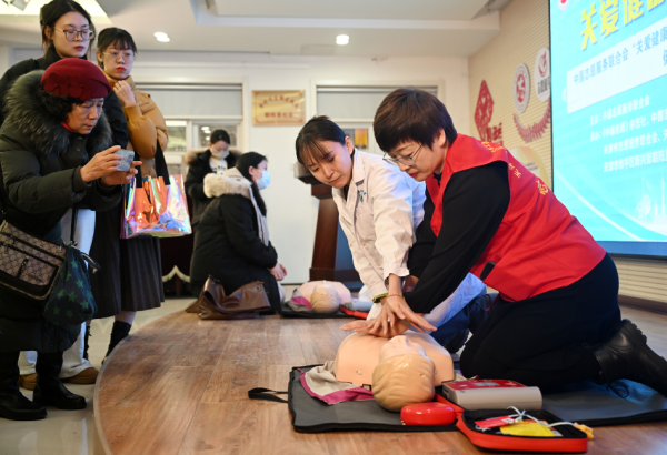 2024年1月17日,在天津市和平區(qū)新興街朝陽里社區(qū),醫(yī)務(wù)人員和志愿者為社區(qū)居民講解心肺復(fù)蘇知識。新華社記者 趙子碩 攝