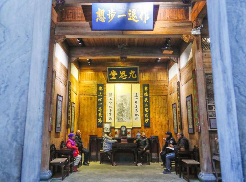 ??天井下,兩張半圓桌拼成的“和合桌”還留著茶水余溫;古宅門額上,“作退一步想”五個(gè)篆字格外醒目。
