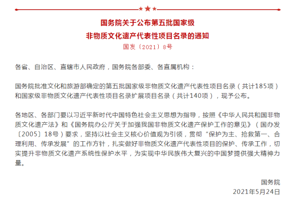 6月10日上午,國(guó)務(wù)院公布第五批國(guó)家級(jí)非物質(zhì)文化遺產(chǎn)代表性項(xiàng)目名錄。