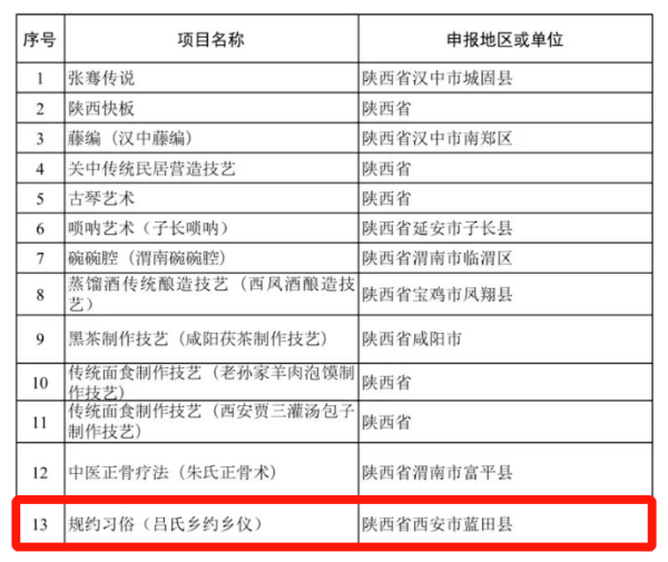 在185項(xiàng)代表性項(xiàng)目名錄和140項(xiàng)代表性項(xiàng)目名錄擴(kuò)展項(xiàng)目名錄中,陜西省共有13項(xiàng)入選。其中,藍(lán)田規(guī)約習(xí)俗(呂氏鄉(xiāng)約鄉(xiāng)儀)入選第五批國(guó)家級(jí)非遺名錄