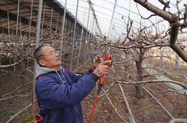 零口街道北潘村,果農(nóng)史紅林正在修剪櫻桃樹枝條。