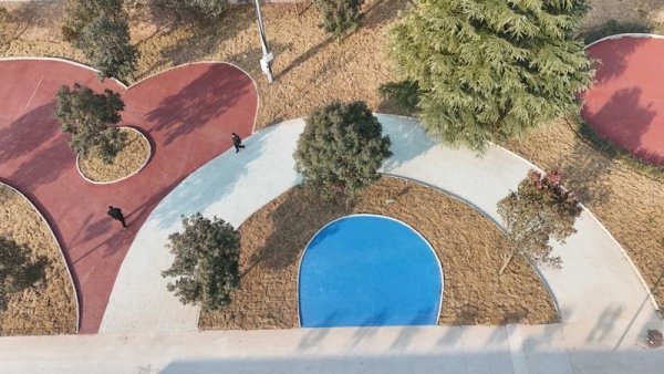 群眾在臨潼區(qū)零口街道大寨村休閑廣場休閑散步。