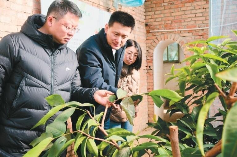 農(nóng)技專家查看大棚西紅柿的生長(zhǎng)情況?!。ㄓ浾摺⊥踅 z)