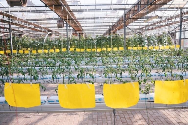 蔬菜大棚內(nèi)布置的粘蟲板。