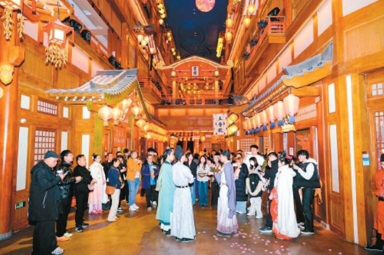 產(chǎn)業(yè)發(fā)展上,“唐詩(shī)+文旅”模式釋放強(qiáng)大動(dòng)能。曲江飛行劇院《長(zhǎng)安之上》《中國(guó)之上》180度球幕投影、全息影像、多聲道環(huán)繞音效及動(dòng)感座椅等多元技術(shù),讓游客“穿越”古今長(zhǎng)安;永興坊內(nèi),“胡麻餅樣學(xué)京都”的詩(shī)意與非遺美食相融,摔碗酒呼應(yīng)“人生得意須盡歡”的詩(shī)情。