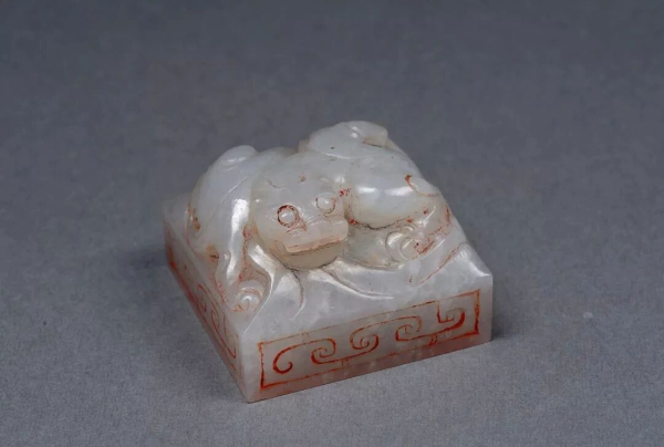 皇后玉璽 漢代。1968年發(fā)現(xiàn)于咸陽(yáng)市韓家灣。印面方正,邊長(zhǎng)2.8厘米,重約33克。璽印為和田玉質(zhì)地,玉質(zhì)溫潤(rùn)潔白,無(wú)絲毫沁色:頂部用螭(chī)虎做紐,四面刻有云紋,印面篆書“皇后之璽”四字,書體流暢,刀法嫻熟。專家推斷,它可能是漢高祖劉邦的皇后——呂雉生前所用的璽印?,F(xiàn)藏于陜西歷史博物館。