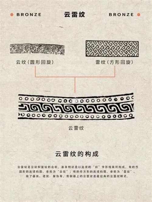作圓形連續(xù)構(gòu)圖的“云紋”和作方形連續(xù)構(gòu)圖的“雷紋”,組合在一起稱為“云雷紋”,是青銅器上最常見(jiàn)的幾何紋樣,盛行于商代至西周。