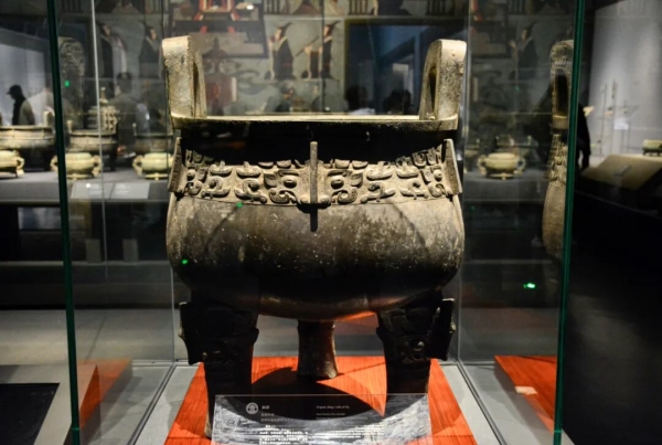 旟【yú】鼎 西周早期。1972年出土于寶雞眉縣楊家村。旟鼎高77厘米,重78.5千克,屬于西周早期常見(jiàn)的立耳獸首垂腹蹄足鼎。鼎腹外鼓而下垂,內(nèi)底與足對(duì)應(yīng)處有3個(gè)直徑11.5厘米、深4厘米的圓窩,圓窩周圍有明顯的足與腹合鑄時(shí)留下的鑄縫。頸部飾有一周饕餮紋,為淺浮雕式,花紋凸起,有以細(xì)密的云雷紋為主紋飾的襯地。三足裝飾有饕餮紋。旟鼎形制渾厚,銘文古樸,具有周初青銅器的特征,銘文鑄刻時(shí)代明確,被認(rèn)為是周康王時(shí)期的斷代標(biāo)準(zhǔn)器?,F(xiàn)藏于陜西歷史博物館。