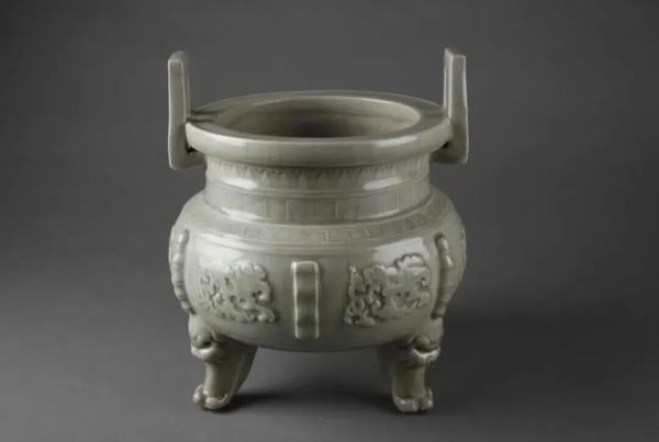青釉刻花三足鼎 金代。1959年出土于西安藍(lán)田城關(guān)鎮(zhèn)南寨金元窖藏。頸部上下飾蓮瓣紋與回紋,肩上飾一圈回紋,腹部仿青銅器貼花夔龍紋飾,兩條夔龍之間分別用竹節(jié)形扉楞和瓦楞形扉楞裝飾,三獸足獸首造型莊嚴(yán),富有神韻。整器通體施月白釉,微微發(fā)青,釉色淡雅勻凈,制作精良?,F(xiàn)藏于陜西歷史博物館。