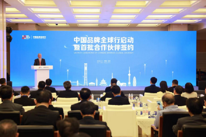 圖為“中國(guó)品牌全球行”城市品牌簽約代表在啟動(dòng)會(huì)上發(fā)言