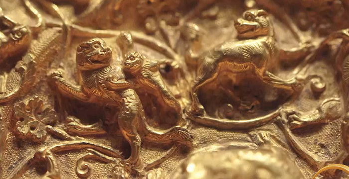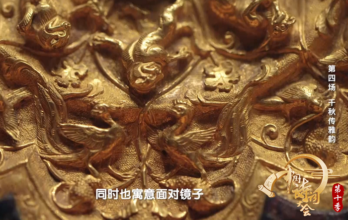 “中國(guó)詩(shī)詞大會(huì)”第十季外景打卡西安博物院,一方璀璨奪目的文物成為焦點(diǎn)——大唐金背瑞獸葡萄鏡。