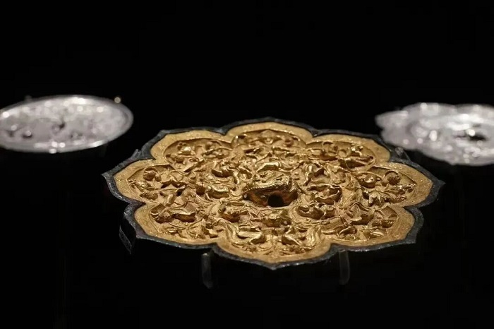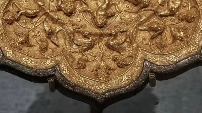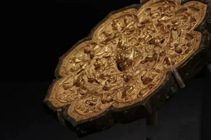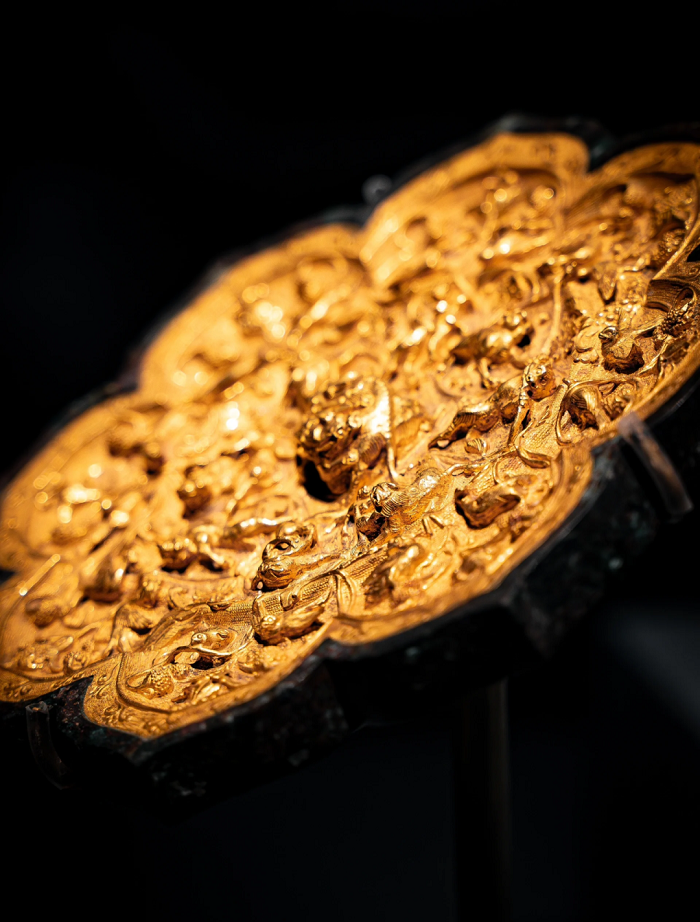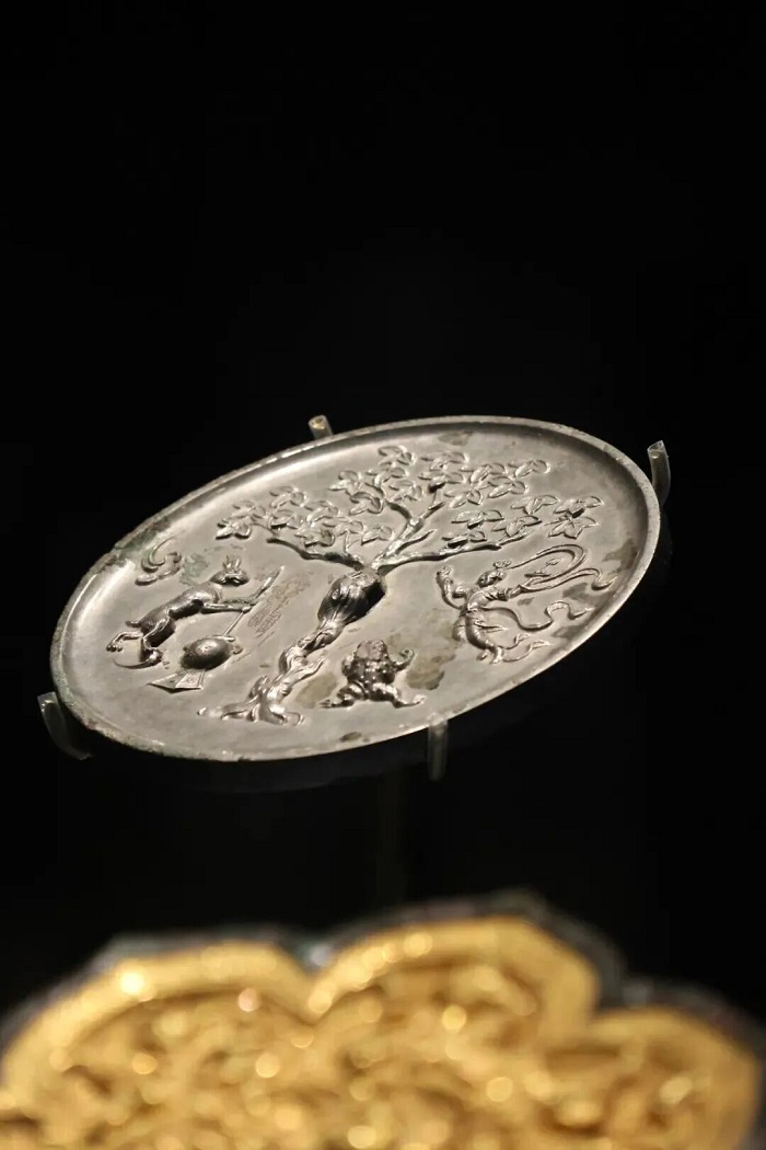 這面銅鏡的誕生,更是融合了錘揲、貼金、鎏金、高浮雕、鏨刻等多種工藝無(wú)縫銜接,工匠們利用黃金極佳的延展性,反復(fù)捶打、鏨刻出精美的紋飾,再與銅胎完美契合,堪稱唐代特種工藝鏡的典范。它不僅是一件器物,更是大唐手工業(yè)繁榮、中外文化交融的直接見(jiàn)證,畢竟葡萄是經(jīng)絲綢之路傳入中原的西域物種,瑞獸則源自中原傳統(tǒng)圖騰,二者相融,正是大唐開(kāi)放包容氣度的生動(dòng)寫照。