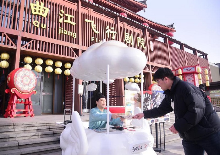 陜西盛世飛躍游樂園有限公司總經(jīng)理(曲江飛行劇院)總經(jīng)理陳琇伶介紹,曲江飛行劇院以沉浸式的科技手段,成為不夜城街頭互動與創(chuàng)意街景的有效補(bǔ)充,讓唐詩從歷史走進(jìn)現(xiàn)實(shí),從書頁走向生活?!伴L安在這里,大明宮在這里,所以唐詩就在這里?!彼齻兿M詣?chuàng)新的方式,把唐詩寫進(jìn)每一位游客的旅程中?!爱?dāng)然,我們的內(nèi)容不僅有‘飛行’,在‘飛行’前還會穿越一條光影長廊,再次邂逅長安的詩詞以及八位唐代NPC,聆聽他們的故事,感受長安城里的愛恨情仇,從而一秒入盛唐。然后開啟一場飛行體驗(yàn),以仰望的姿態(tài)跟著唐詩去觸摸長安城的一磚一瓦?!标惉L伶介紹說,春節(jié)期間,劇院特設(shè)多次禮贈活動,新增“新春財(cái)神”角色,提供“乘福起飛,詩韻藏金”的互動與彩頭體驗(yàn)。升級“花魁”“風(fēng)流花鳥使”等六大長安經(jīng)典NPC,提供全新互動體驗(yàn);在場內(nèi)區(qū)域提供奉茶、梅子糖等暖心服務(wù),讓游客賓至如歸。還將用燈籠、宮燈及盛唐飛天圖騰布置門頭美陳,烘托節(jié)日打卡情緒,而且門票價位也有優(yōu)惠,總而言之,就是讓市民游客在飛躍長安時,也能有滿滿的情緒價值。