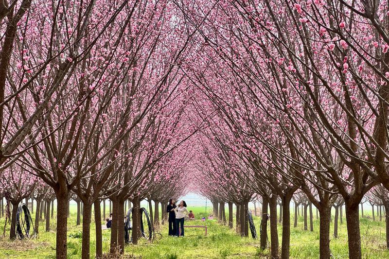 在鄠邑區(qū)丁村梅園,市民游客穿梭花間打卡賞春。(記者 郝鐘毓攝)
