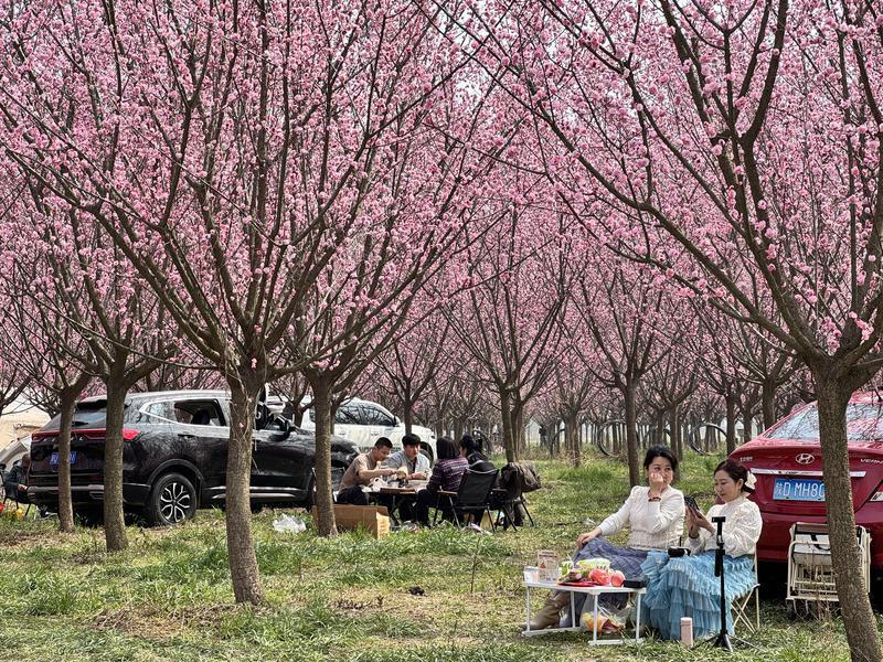 穿漢服的姑娘們?cè)跇?shù)下拍照,油紙傘舉著,裙擺拖在地上,沾染了幾片花瓣;小孩子跑來(lái)跑去,大人們喊著“慢點(diǎn)兒”;賣(mài)小吃的攤子前排著隊(duì),烤面筋、甑糕、咖啡,熱氣騰騰……人是真的多,村道兩邊的車(chē)停出去老遠(yuǎn)。