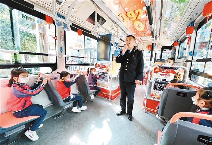 “孩子們,在站臺上等車時不要打鬧嬉戲;公交車靠站后,要按次序上車,坐穩(wěn)扶好,手和頭不能伸出車窗……”公交二公司43路公交車駕駛員李剛耐心地給孩子們講解和演示。